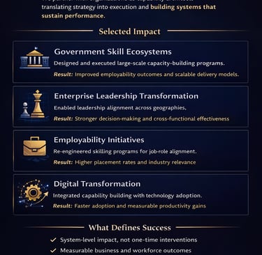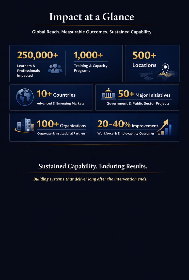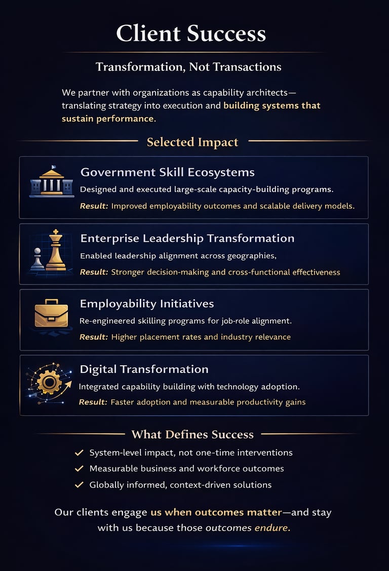 From partnering with governments on nationwide skill development and employability initiatives to enabling organizations to build future-ready capabilities, our purpose remains constant - "To translate insight into structured action, and to build institutions that are resilient, adaptive, and capable of delivering impact where it matters most"